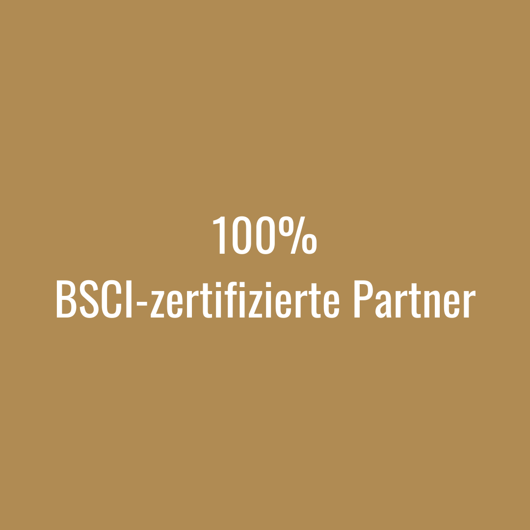 Soziale Verantwortung ist Kern unseres Unternehmens. Durch den BSCI-Verhaltenskodex haben wir uns verpflichtet, soziale Standards im Herstellungsprozess einzuhalten. Das bedeutet, dass in unseren Partnermanufakturen und Produktionsstätten faire, saubere und gerechte Arbeitsplätze gewährleisten.
