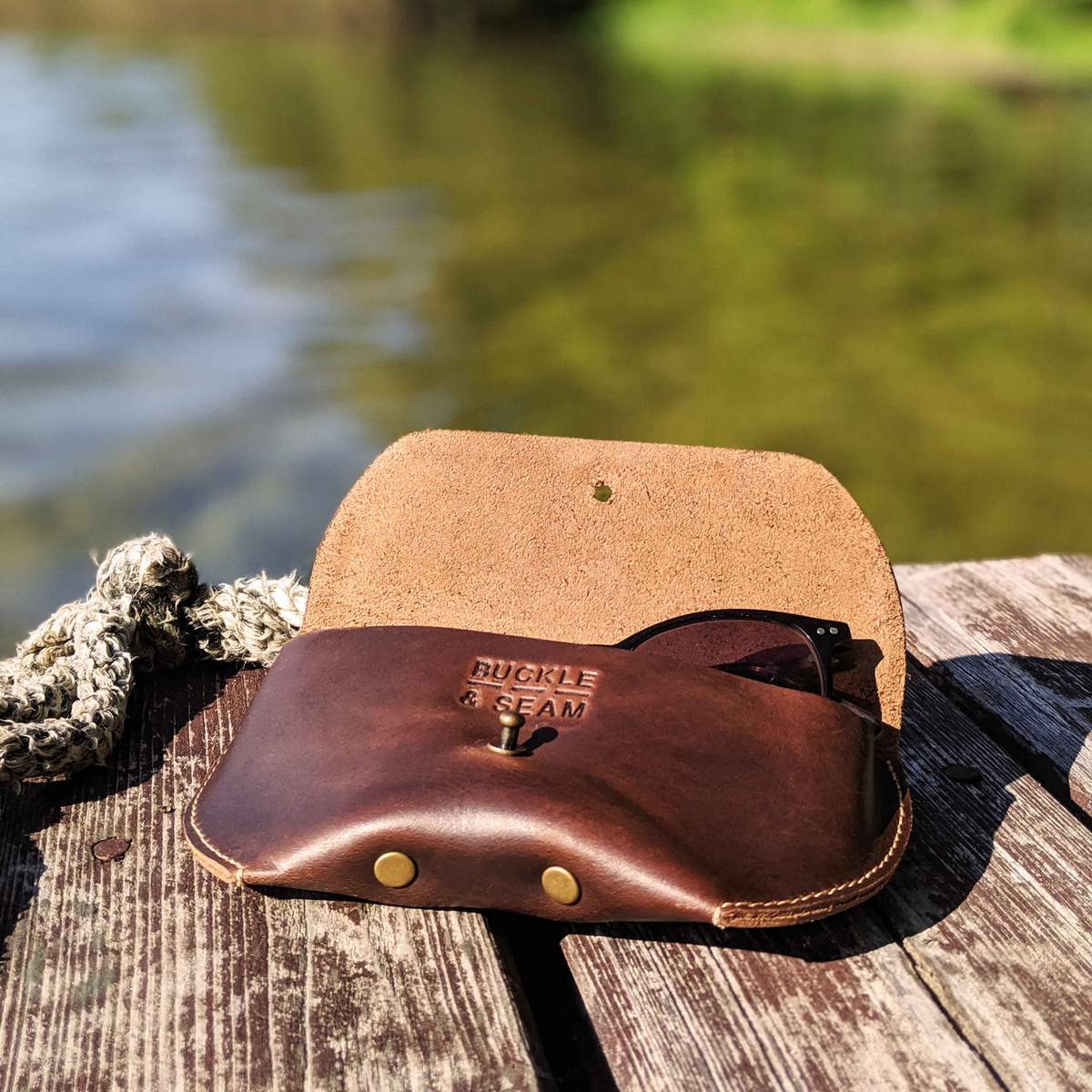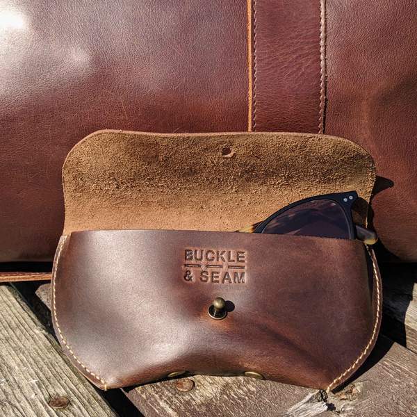 Das Brillenetui Arizona besticht durch sein ausgefallenes Design. Natürliches, satt braunes Leder kombiniert mit hellen Nähten und Accessoires. Besonders herausstechend an dem Brillenetui aus Leder ist der einfache, aber äußerst effektive Verschluss. Hiermit musst Du Dir keine Gedanken darum machen, dass Deine Brille doch einmal unbemerkt ihren Weg aus dem Etui findet. Die Buckle & Seam Prägung oberhalb des Verschlusses kannst Du mit einer persönlichen Gravur ergänzen. Wie wäre es zum Beispiel mit den eigenen Initialen? Oder aber Du verschenkst das Brillenetui an einen tollen Menschen und hast so die Möglichkeit, ein außergewöhnliches Geschenk zu schaffen.