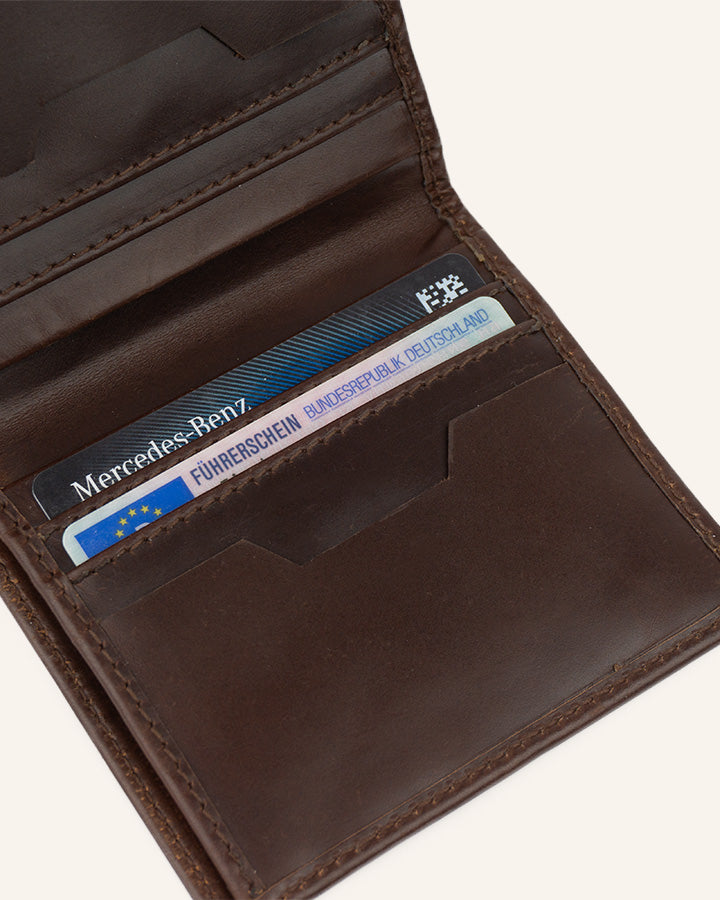 Unser Leder Portemonnaie Edgar für Herren ist klein und kompakt und somit super leicht verstaubar. Es bietet Dir ein Fach in das bis zu 100€ Scheine ihren Platz finden können. Es gibt 8 Kartenfächer.